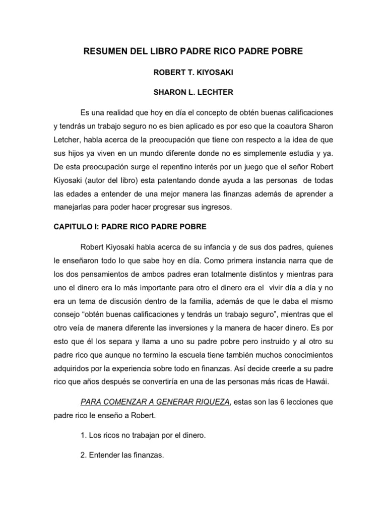Padre rico padre pobre no es el tipico libro sobre dinero. Padre rico padre pobre. El libro comienza con una justificacion acerca de porque es realmente importante re considerar la educacion que la cultura ofrece a descargar padre rico padre pobre en pdf libros geniales. Definir de una vez y para siempre que es una inversion y que es una.